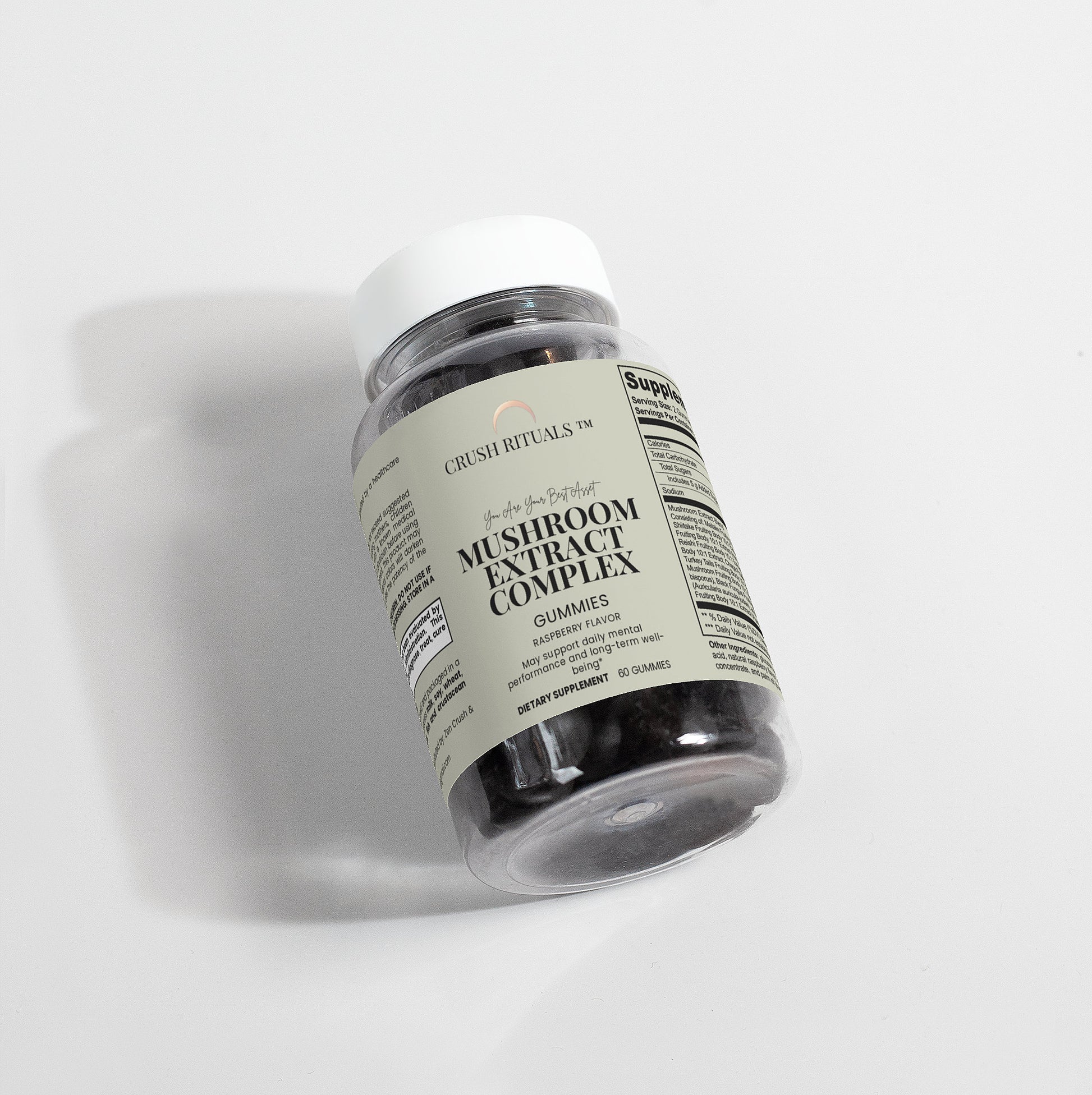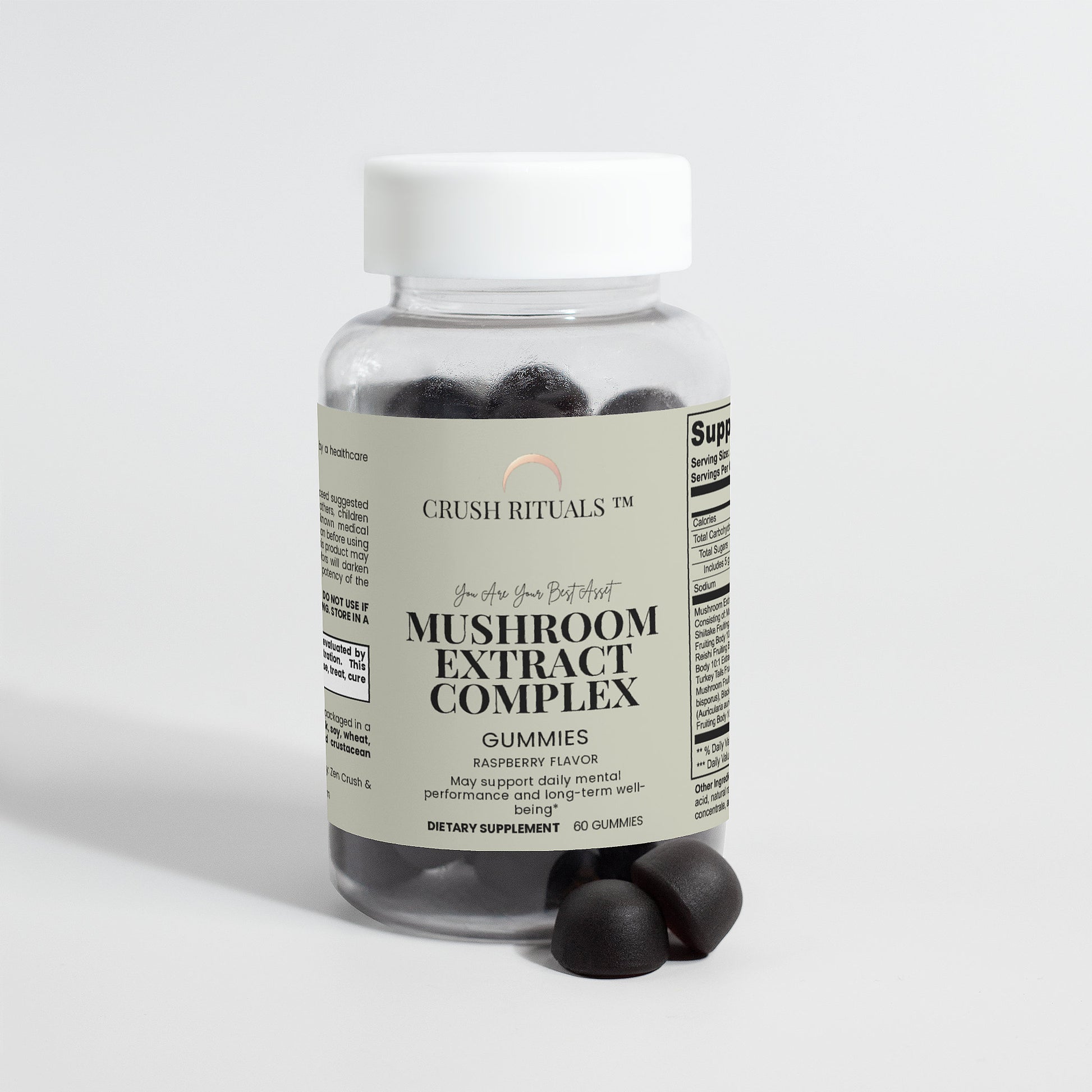 Ingredients: Mushroom extract (Maitake Fruiting Body 10:1 Extract, Shiitake Fruiting Body 10: 1 Extract, Lion’s Mane Fruiting Body 10:1 Extract, Reishi Fruiting Body 10:1 Extract, Cordyceps Fruiting Body 10:1 Extract, Chaga Fruiting Body 10:1 Extract, Turkey Tails Fruiting Body 10:1 Extract, White Button Mushroom Fruiting Body 10:1 Extract, Black Fungus Fruiting Body 10:1 Extract, Royal Sun Mushroom Fruiting Body 10:1 Extract), glucose syrup, sugar, dextrose, pectin, citric acid, natural raspberry flavor, sodium citrate, purple carrot juice concentrate, palm oil (contains carnauba wax).